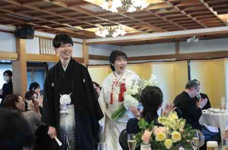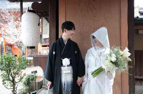 京都らしい式にしたくて、神前式に憧れがありました。 厳かな雰囲気で家族に見守られながら行った式は一生の思い出です。式当日は雨だったのですが、神主さんの「恵の雨」という言葉は夫婦共々印象に残っています。 参進の儀では、友人や観光客の方にたくさん祝福の声をかけていただけました。 本当にきれいな桜の花が咲く中、和装で式を挙げられて嬉しかったです。