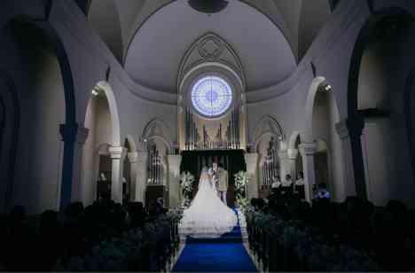 打ち合わせの中でも、1番時間がかかると言われているのがドレス選びです。ご新婦様が選んだウェディングドレスは細かな刺繍やスパンコールが散りばめられたこだわりいっぱいの1着。約1000種類の中から選び抜いたドレスです。その姿を親御様はもちろん、ゲストの方はとても楽しみにされております。 ロイヤルブルーのバージンロードが新婦様をよりきれいに、美しく際立たせます。
