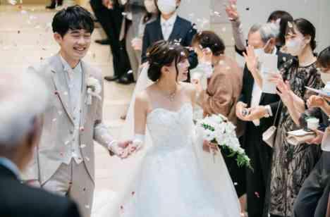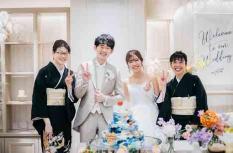 感動的な挙式が終わった後は、おふたりの大好きな音楽をかけてフラワーシャワーのお時間です。気候も天気も気にならない室内での空間で、「おめでとう!」とゲストからの最高の祝福を受けました。フラワーシャワーが終わった後は、おふたりの大好きなゲストのみなさまとの集合写真を撮り、笑顔が溢れる素敵なお写真の記録が残りました。