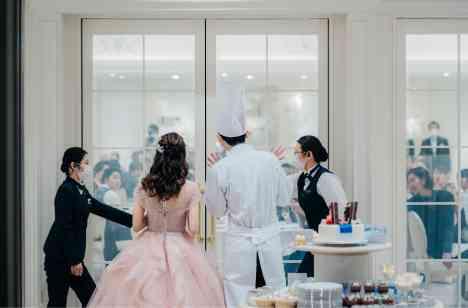 かわいいデザートがずらっと並ぶビュッフェのお時間。その中には、おふたりがデザインしたデザートも!女性ゲストやお子様ゲストはもちろん男性からも大好評でした。そして、ご新郎様がコックコート姿に大変身しており、大盛り上がりのお時間に!また、おふたりも、お越しいただいたゲストの方々も、笑顔が絶えないご結婚式となりました。