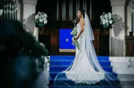 新婦がずっと結婚式で着たいと夢見ていたオーダーのウエディングドレス。何度も試着を重ね、こだわりぬいたこの1着で結婚式をしたいという新婦の夢を叶えることができました。青のバージンロードの上に立つと純白のウエディングドレスが綺麗に映え、家族からも友人からも「綺麗だったね」と言われ、本当に嬉しかったです。