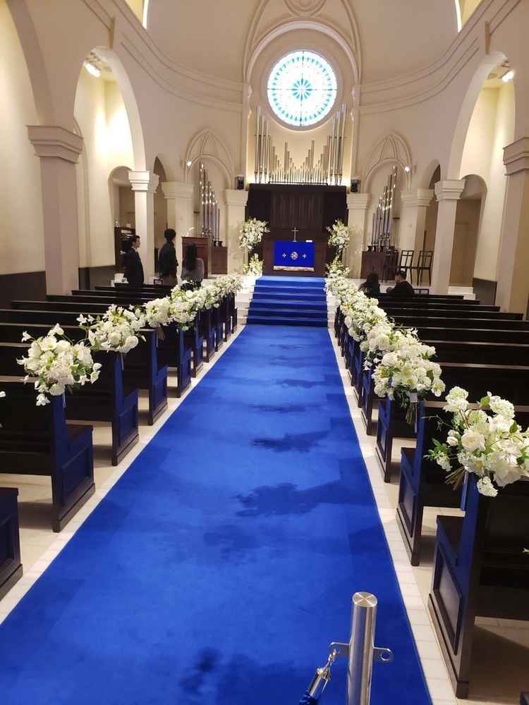 青いヴァージンロードがすごく綺麗でした。披露宴会場の天井が高くて解放感がありゆっくり過ごせそうだと思います。