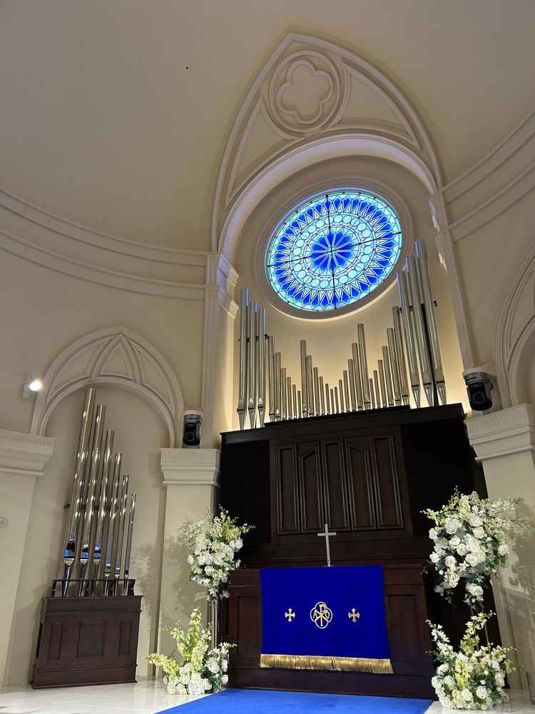 白基調で、青のバージンロードとステンドグラスが映える大聖堂が綺麗な式場。式場内の明るさの調整ができることがよかった。