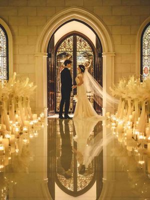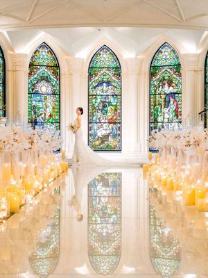 都内最長級といわれる22メートルの長さを誇る希少な白大理石のバージンロード。おふたりの姿とステンドグラスが反射して映り込む様子はお写真映え抜群。