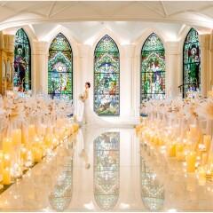 【360度アンティークステンドグラスに囲まれた上質空間】英国の由緒ある教会から譲り受けたクラシックな17枚のステンドグラスに360度囲まれたチャペル。全天候型で明るい雰囲気や厳かな雰囲気にも変えることが可能