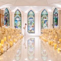 【360度アンティークステンドグラスに囲まれた上質空間】英国の由緒ある教会から譲り受けたクラシックな17枚のステンドグラスに360度囲まれたチャペル。全天候型で明るい雰囲気や厳かな雰囲気にも変えることが可能