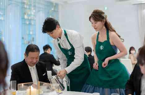 大手コーヒーショップにお勤めの新郎新婦様。他の人と被らない、お二人らしい演出をしたいとのご要望で、普段お仕事で着ているエプロンを身に着け、ゲストへコーヒーを振る舞う演出を行いました!いつもの二人らしさを感じられるオリジナルの演出にゲストも大喜び✧最後にお渡しするプチギフトもコーヒーショップもアイテムをお持ち込みされ、大変好評でした。