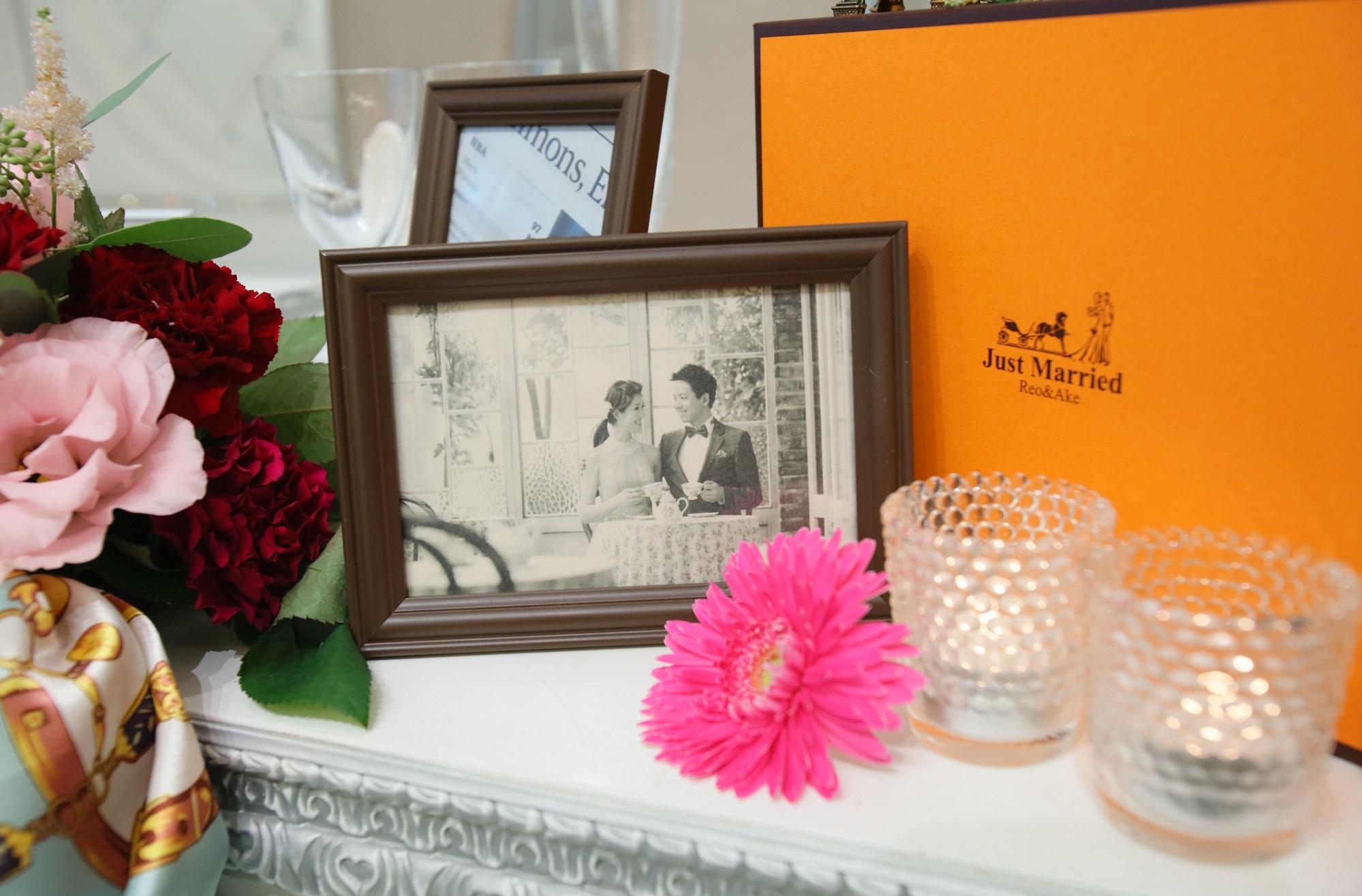 箱やお写真スカーフも装飾に♪ メインテーブルの装飾とご新郎様のネクタイ、ご新婦様のヘアアクセサリー全てがマッチング♪