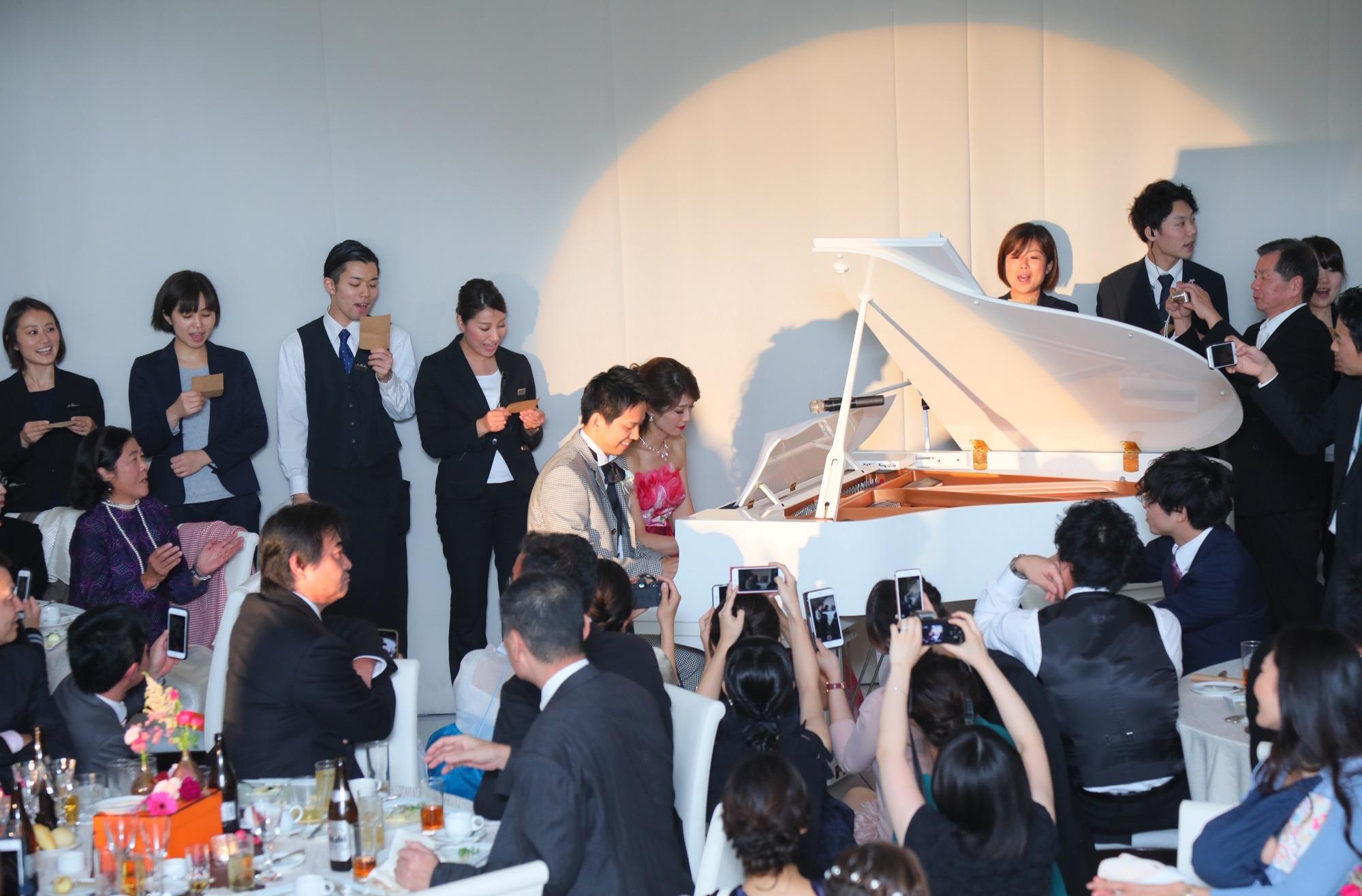 ご新郎ご新婦様の連弾に合わせ、スタッフが一緒に歌い会場に一体感が生まれました・・・!