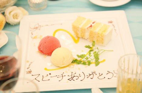 お越しいただいたゲストの方一人一人を想ってのおもてなし。 大事なスピーチのシーンを務めてくれたご友人様にはお礼がしたい!とお打ち合わせでおっしゃっていましたので、なんとデザートプレートにメッセージが。
