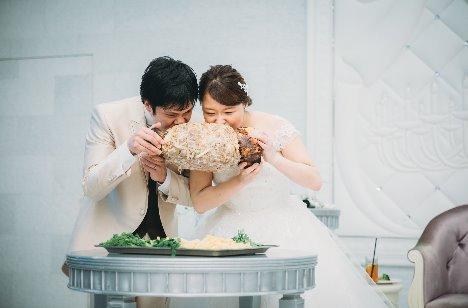 お肉が大好きなお二人なので、結婚式のテーマは“THE MEAT” シェフとのお打合せを経て、おふたりオリジナルメニューでゲストの皆様をおもてなししました。 巨大な塊肉はシェフのお手製!インパクトのあるシーンにゲストの皆様も思わず笑顔でカメラのシャッターを切ってしまう楽しいワンシーンとなりました。