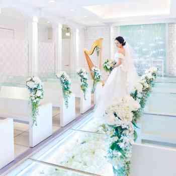 1件目来館でもれなく挙式料をプレゼント!透明感のあるガラスのバージンロードと水の音が心地よいチャペル