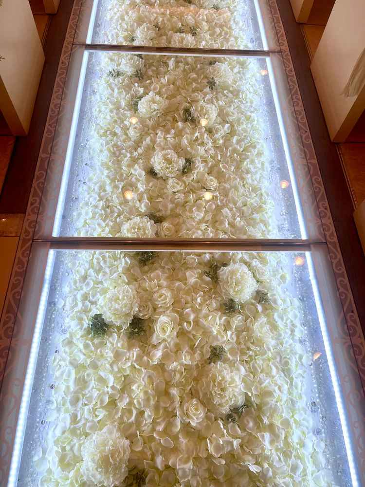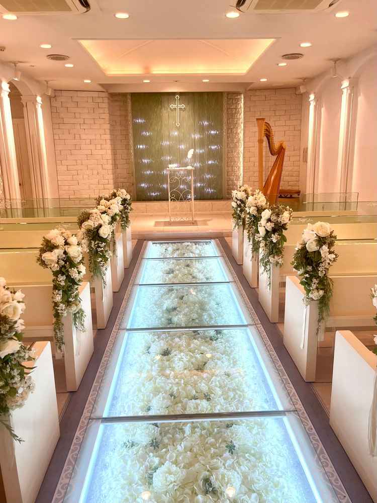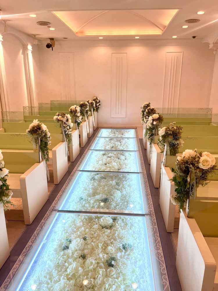 当初の予想通り、少人数婚にむいているこぢんまりとした雰囲気のチャペルでした。 とくにバージンロードは花や宝石が散りばめられていて綺麗でした。