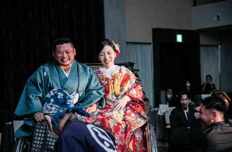 和な雰囲気もお好きなお二人にピッタリな演出 「人力車」を使って紋付袴と色打掛でお色直し入場を行いました。 ゲストの皆様はまさか人力車で入場するとは思わず、 沢山の方がカメラを構え、珍しい入場スタイルにシャッターを切っていました。 事前に車夫さんと入念な打合せを行い、当日の朝にもリハーサルを重ね 見事大成功した入場演出となりました。