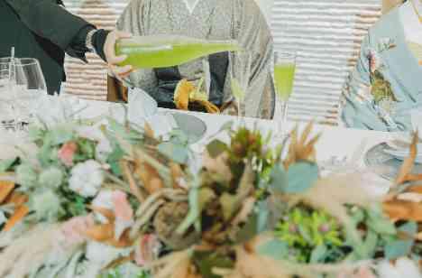 お二人こだわりは新郎様が作ったお茶で乾杯すること。 お打ち合わせの中でどこかでお二人らしさを出したいね!という ご相談があり、それでしたら日頃より丹精込めて作っていらっしゃいますお茶を乾杯のドリンクとして使用する事をご提案させていただきました。 当日は水出し緑茶を乾杯の際のドリンクとして全員に振る舞いまし、素敵な披露宴スタートとなりました。