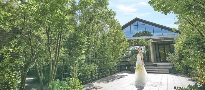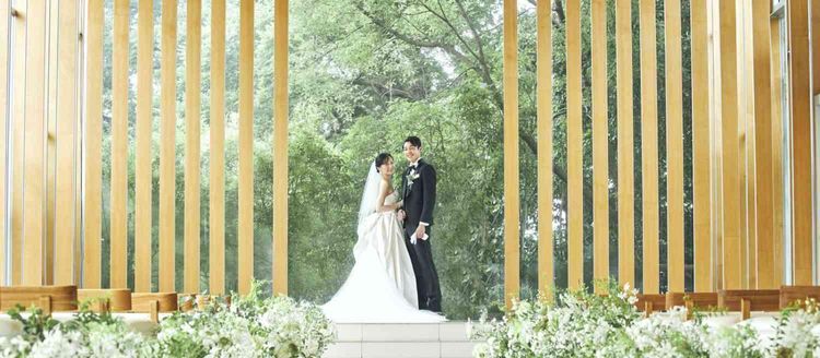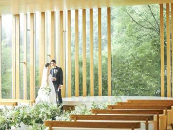 奈良町 あしびの郷の大人気のチャペルは緑と自然光いっぱいのチャペルです。壁一面が窓になっているので、屋内にいながらもまるでガーデンウェディングのような雰囲気の中で挙式を行うことができます。もちろん、ガーデンでのウェディングも可能。プランナーに相談を