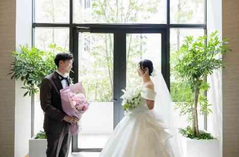 新緑の季節、凛とした空気の中で行われたファーストミート。 背中を向けて待つ新郎の肩を、新婦がそっと叩きます。振り返った瞬間、視界に飛び込んできたのは新郎が用意したサプライズの花束。予期せぬ贈り物に、新婦の表情からは自然と笑みがこぼれました。 瑞々しい緑を背景に、花束を挟んで向き合う二人。気取らないやり取りの中に、お互いを想う純粋な気持ちが映える、温かなシーンとなりました。