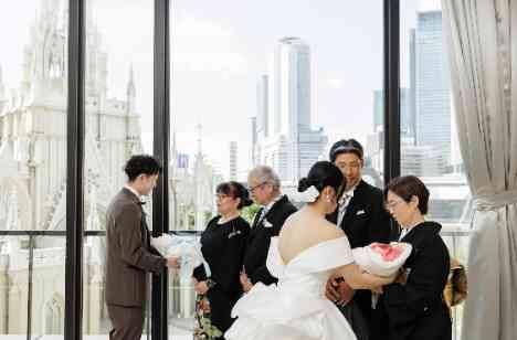 大きな窓から大聖堂を望む、開放感あふれる親族専用の会食会場。差し込む柔らかな日の光が、家族で囲む食卓をあたたかく照らし出します。 閉鎖的な印象を感じさせない、華やかで洗練されたロケーション。大聖堂の存在感を間近に感じながら、美味しい料理を囲む穏やかな時間は格別です。堅苦しさのないこの場所だからこそ、いつもの二人らしい自然体な言葉で、これまでの感謝を伝えることができました。