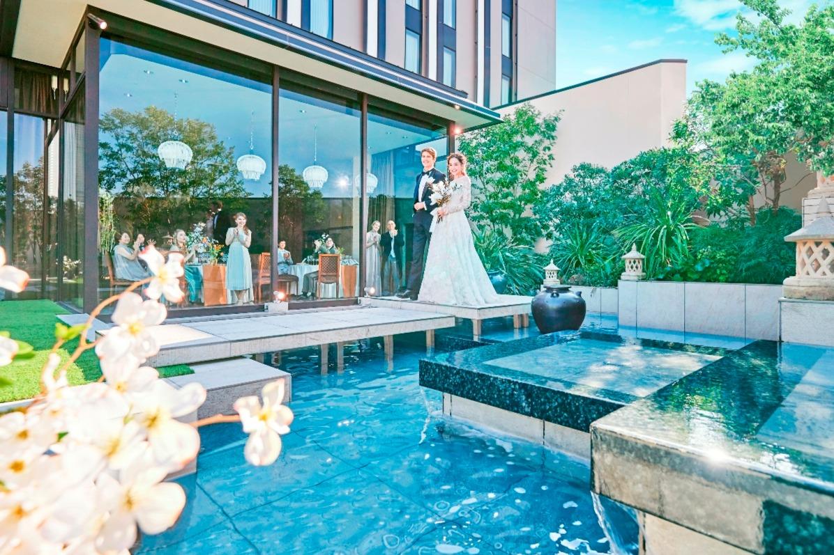 ドレスも和装も似合うガーデンビューのバンケットルームは最先端の流行を取り入れ、木々の美しさや木漏れ日、せせらぎの音を楽しめる上質空間な空間。 【収容人数:~100名】