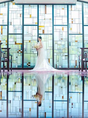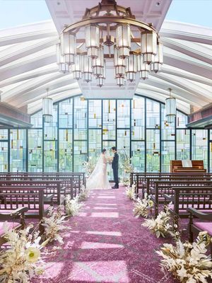 ステンドグラスをふんだんに取り入れ、宗教色のないモダンテイストに仕上げたチャペルは挙式スタイルを選びません。だからこそ洋装はもちろん和装での挙式も◎