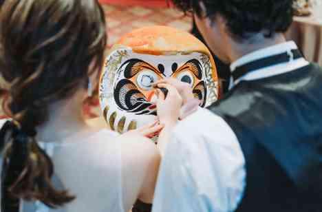 お待合で皆様にお手伝いをいただいいたこのカラフルなだるまがが、おふたりの結婚証明書。 結婚生活において大切だと思う3つで彩られただるまに、皆様の前で目入れをされました。 赤色は愛 金色はお金 オレンジ色は協力の意味をもち ゲストの皆さまが自由におふたりを思い浮かべながらペイントしてくださいました。