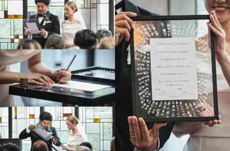 扉が開くとそこには自分の人生でお世話になったかけがえのない人たちがおられ、あたたかい拍手と共に新郎新婦様がそれぞれ入場をされます。 「互いに思いやる気持ちを忘れないことや互いの家族や友人を大切にすること」を誓いの言葉として読み上げられた新郎新婦様。 実はこの誓いの言葉は結婚証明書にもなっており、おふたりとゲストのみなさまで作り上げた世界でたった一つのウェディングアイテムの完成です