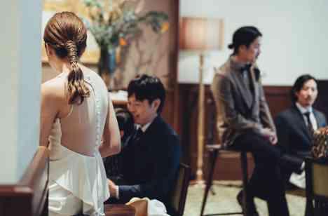 お越しくださったゲストのみなさまがお過ごしになる待合に現れたのは主役のおふたり。ゲストとおふたりがお会いする初めての場所は挙式会場というイメージがおありかもしれませんが、THE CONDER HOUSEでは貸切だからこそ1Fのお待合で新郎新婦様がお出迎えすることもできます。 堅苦しさを完全に取っ払いとにかく自由に過ごすことを大切にされたおふたりらしい演出です