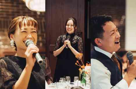 お料理やお酒も進み、より会場内が盛り上がってきたパーティーの後半では、お越しくださった方のお声をサプライズインタビュー形式でお伺いしていきました。 緊張せず自然にお話いただけるようにゲストのお名前はあだ名でご紹介して、おふたりとの思い出話に花を咲かせ、会場内は大盛りあがりでお過ごしいただきました。