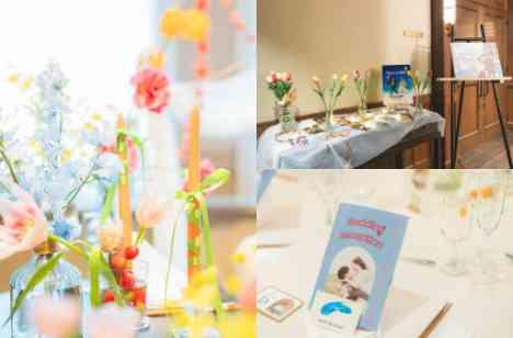 暖色と寒色の組み合わせと春らしいあたたかみのある雰囲気で、カラフルかつトレンド感のあるフルーツやリボンでお色味を取り入れました。大切な日にはご友人とお花を贈り合うほどお花が好きなご新婦様のリクエストで、お花が引き立て役になるというよりはおふたりがお花に囲まれているようなスペシャルなコーディネートに。