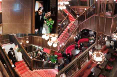 2部目のPartyはカジュアルにありのままに普段のおふたりらしさが出せるようにあえて披露宴入場ではじめてお会いするのではなく、大階段でサプライズウェルカムパーティを行いご友人の皆様をお出迎えいたしました。 WelcomeSpaceにはこれまでのおふたりの思い出写真をぎゅっと詰め込んで今までを振り返るような写真展を用意しました。