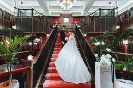 一生に一度だから周りの人にありがとうを伝えたい。そんな想いからおふたりはゲストとの距離が近い自由で温かな時間を大切にしました。柔らかな光が差し込むお昼時、会場に1歩足を踏み入れると天井まで伸びる「大階段」がお迎えいたします。大切なゲストの皆様が集まる瞬間に胸を躍らせながら、まずはおふたりだけの時間を。ゆったりと記録となる大切なお写真を残していただくお時間となりました。