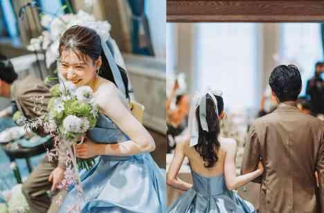 お色直しでは【MARK INGRAM for VALENTINI】のカラードレスをセレクト。上品な光沢を放つ生地と透明感のあるトーンが印象的でした。 投票でドレスの色を予想する演出を行い、再入場の瞬間には歓声と拍手が沸き起こりました。その後はお2人がゲストの皆様の元へテーブルフォトラウンド。笑顔がたえない時間が続きます。