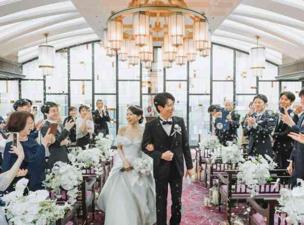 ステンドグラスから差し込む光がおふたりを柔らかく照らします。ジャケットセレモニー・べールダウン・親御様の思いを乗せて挙式が始まります。新郎様のもとへ歩むその姿にゲストの目にも涙が浮かびました。今まで関わってきたおふたりを想う大切な皆様に囲まれ過ごすひととき。永遠の誓いを交わし、祝福の拍手が鳴り響きます。