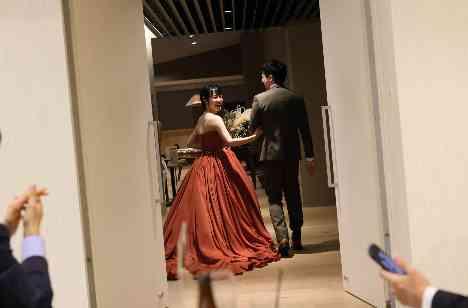 「ゲストとの時間を大切にしたい」というお二人。披露宴中は会食歓談の時間を軸にして進行を組みました。また、お二人がゲストのテーブルに行き、お話をするシーンがありました。この際、新郎は新郎ゲストテーブル、新婦は新婦ゲストテーブルに行き、80名というゲストに向けて結婚式という特別な日だからこそできるお話に花を咲かせていました。