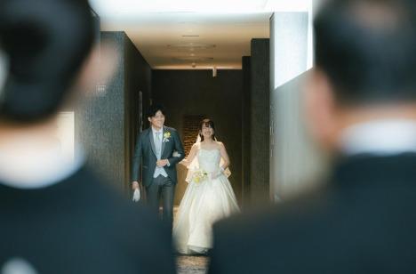 挙式前、お支度が整い、いよいよ挙式会場へ移動のシーン。 一日の中で一番緊張される場面。 そんな中でお出迎えしていただくのはご家族。 ご家族のお顔を見て、笑顔の新郎新婦様には安心・嬉しさと共に、寂しさも感じられる瞬間。 おふたりとも少し照れ臭そうな、緊張が少しほぐれた瞬間で、あたたかいシーンになりました。
