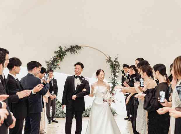 新郎新婦様の退場シーン ゲスト様全員が一列に並び、フラワーシャワーと共に新郎新婦様に「おめでとう」の言葉を贈りました。 皆様の笑顔と「おめでとう」のあたたかい祝福の気持ちが飛び交うバージンロード。 大切なゲストの皆様に囲まれた、しあわせな表情の新郎新婦様をみて、プランナーも感極まる瞬間でした。