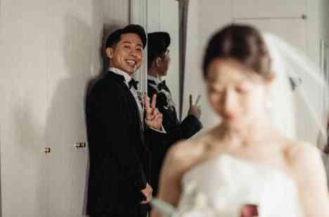 結婚式当日の朝にご来館されたときは緊張とワクワクが入り混じった様子の新郎新婦様。 その後新郎新婦様専用のお着替え部屋にてお支度をスタートしていきます。 新郎新婦様のお支度も整い、挙式のお時間も近づきとても緊張しているかと思いきや、真剣な新婦様の写真撮影中に、ちょっとおふざけしてみる新郎様に心が和みました。