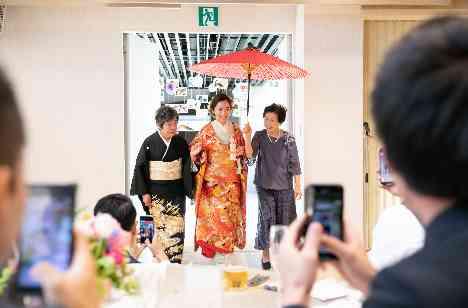 大好きなおばあちゃんと一緒に歩きたいという想いがあったMASUMIさん。打合せをする中で、どの衣装が一番おばあちゃん達が喜ぶだろう…と考えました。そこで、お色直し入場のエスコート役にご両家のおばあちゃんを指名しました。色打掛がとってもお似合いです!おばあちゃんの好きな曲で入場しました。ウエディングドレス姿も素敵ですが、和服姿のお嫁さんはご家族様に喜ばれるポイントですよ♪