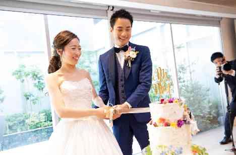 今流行りのエディブルフラワーを使用したウエディングケーキ!これも新婦M様のこだわりのケーキです。お花を飾りつけてくださったのはお二人の為に集まってくれた大切なゲストの皆様!ゲストの皆様に素敵に飾って頂いたケーキに入刀するお二人はとっても楽しそう!ケーキも会場の雰囲気とピッタリ。世界に一つだけのウエディングケーキが完成しました。