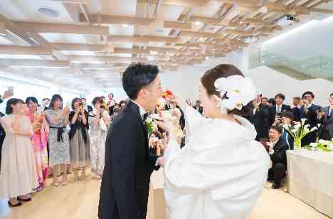 木・和紙・障子など、日本を感じるプライベートチャペルにて、オリジナル和装人前式を実施いたしました。新婦のお母様による紅差しの儀、新郎新婦の退場演出として折鶴シャワーなど、和装に因んだ演出も行いました。