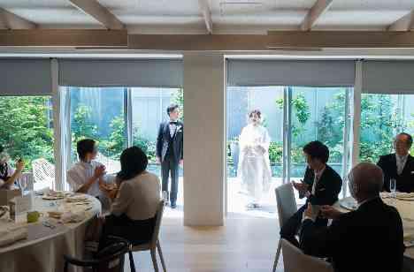 お色直しは洋装と和装の組み合わせ。司会者からの注目アナウンスは入れず、新郎新婦がどこから入場してくるのか、列席者にサプライズでガーデン入場(ブラインドオープン)を行いました。入場口と新郎新婦の衣装に会場内が感動で溢れました。