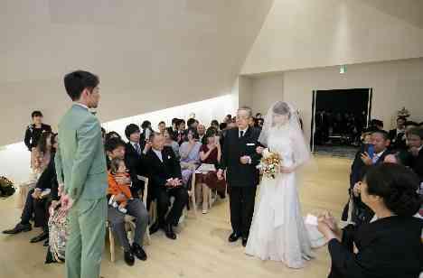 新婦のお母様は神前式だった為、バージンロードを歩いたことがないおじいちゃん。「バージンロードを一緒に歩きたいな。その為に長生きする。」そんなおじいちゃんの夢を絶対に実現しようと決めていた新婦。新婦がおじいちゃんのペースに合わせて、一歩ずつゆっくり歩くことで、ゲストに写真をたくさん撮ってもらえました。