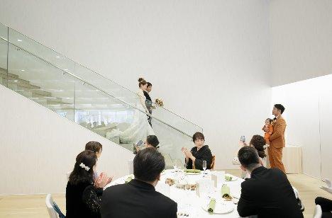 おじいちゃんとチャペルのバージンロードを歩いた新婦。お父様がおじいちゃんにバージンロードを譲ってくれたとはいえ、父の娘に対する想いも決して野放しにはしません。披露宴では、お父様のエスコートで階段入場を行い、新婦を新郎に引き渡しました。