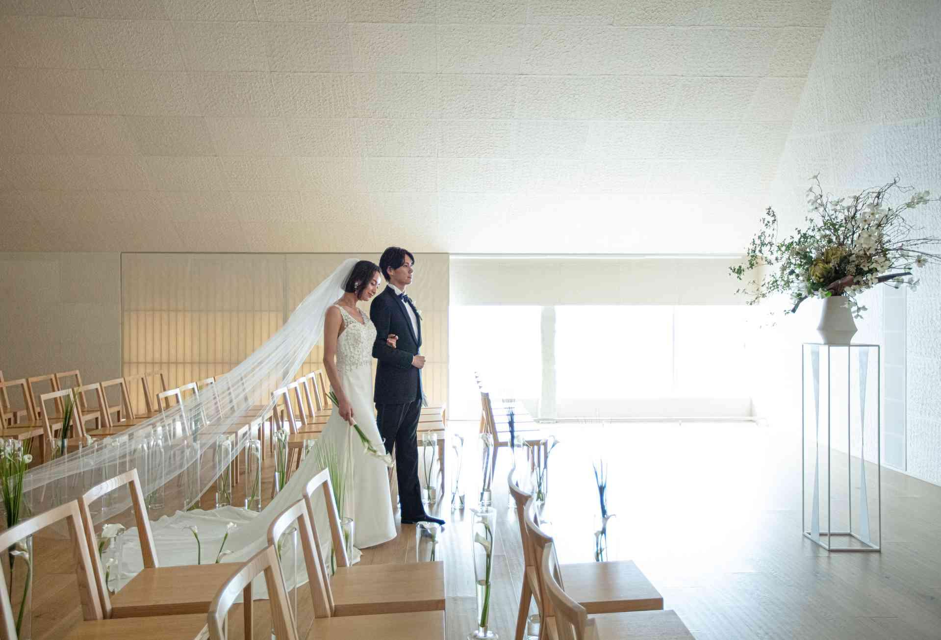 建築家「隈研吾氏」によるチャペル。職人が手作業で仕上げた和紙づくりで、日本の伝統美と自然の温かみが随所に溢れています。ゲストとの距離が近く、一体感を感じながら挙式時間をお過ごしいただけます。