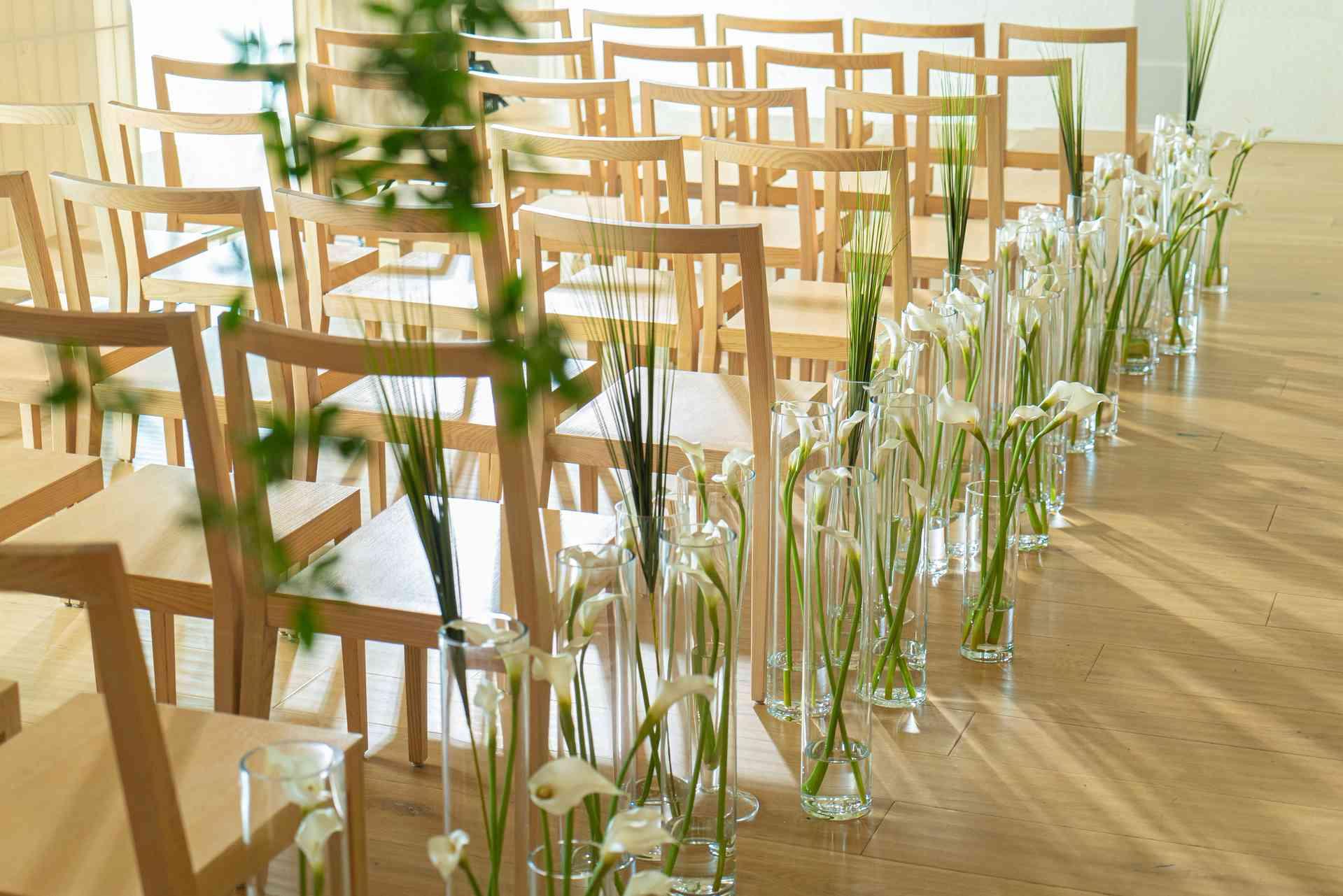 洗練されたデザインの中にも、落ち着きのあるデザインが印象的な空間。お二人のイメージに合わせてフローリストがコーディネートをご提案。シンプルな創りだからこそ様々なテイストが合うチャペルとなっています♪