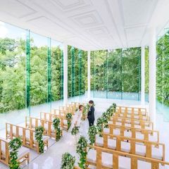 【美しい緑に囲まれた3面ガラス張りのチャペル】天候に左右されず、屋内にありながらも美しい緑と陽光に包まれたチャペルで、感動に満ちた一時を過ごそう。大切な挙式入場シーンを体感。感動のムービー演出体験も