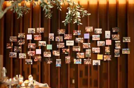 当日100名もの大切な人たちが集まってくれた結婚式。 今までの人生でお世話になった大切な人たちを思い返しながらご準備を頑張ってくださったお二人。 そんなゲストの皆様とのお写真を飾ったお待合いのラウンジスペースは貸し切りのキャッスルガーデンOSAKAならではのポイントになっております。お写真を見たゲストの皆様も喜んでくださるそんなシーンになります。