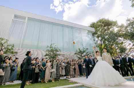 挙式の後は、ゲストの皆様と一緒にガーデンでアフターセレモニーを実施しました。お天気にも恵まれ、青空の元でしたブーケトスは、とても盛り上がっていました。 キャッスルガーデンOSAKAでは、チャペルの中や大階段などアフターセレモニーを実施できる場所がありますが、お天気によってはガーデンでの演出も可能です。