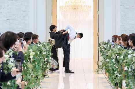 「ジャケットセレモニー」とは、ご新郎の最後の支度を親御様に手伝ってもらう演出です。 挙式でのご新郎様入場時、扉が開いた時にはノージャケット姿のため、ゲストにとってもサプライズになります。ジャケットを手にしたお母様がご新郎様に着せるお手伝いをします。幼少期に親御様がお洋服を着せてくださったことを思い出し、思わず目頭が熱くなる演出です。