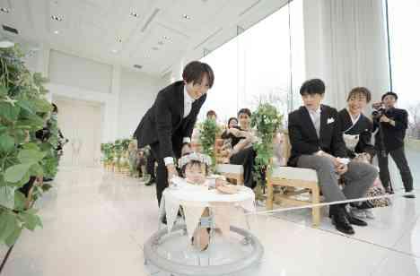 挙式では、お子様にリングガールの大切な役目をお願いしました。上手に歩くことができないとリングガールはできませんか?とご質問をいただくこともありますが、このように椅子に座っていただき、ロープで引っ張ったり、車を運転しているような演出も大人気です! 挙式中笑顔で大好きなご新郎ご新婦様の元までリングを運んでくれました!